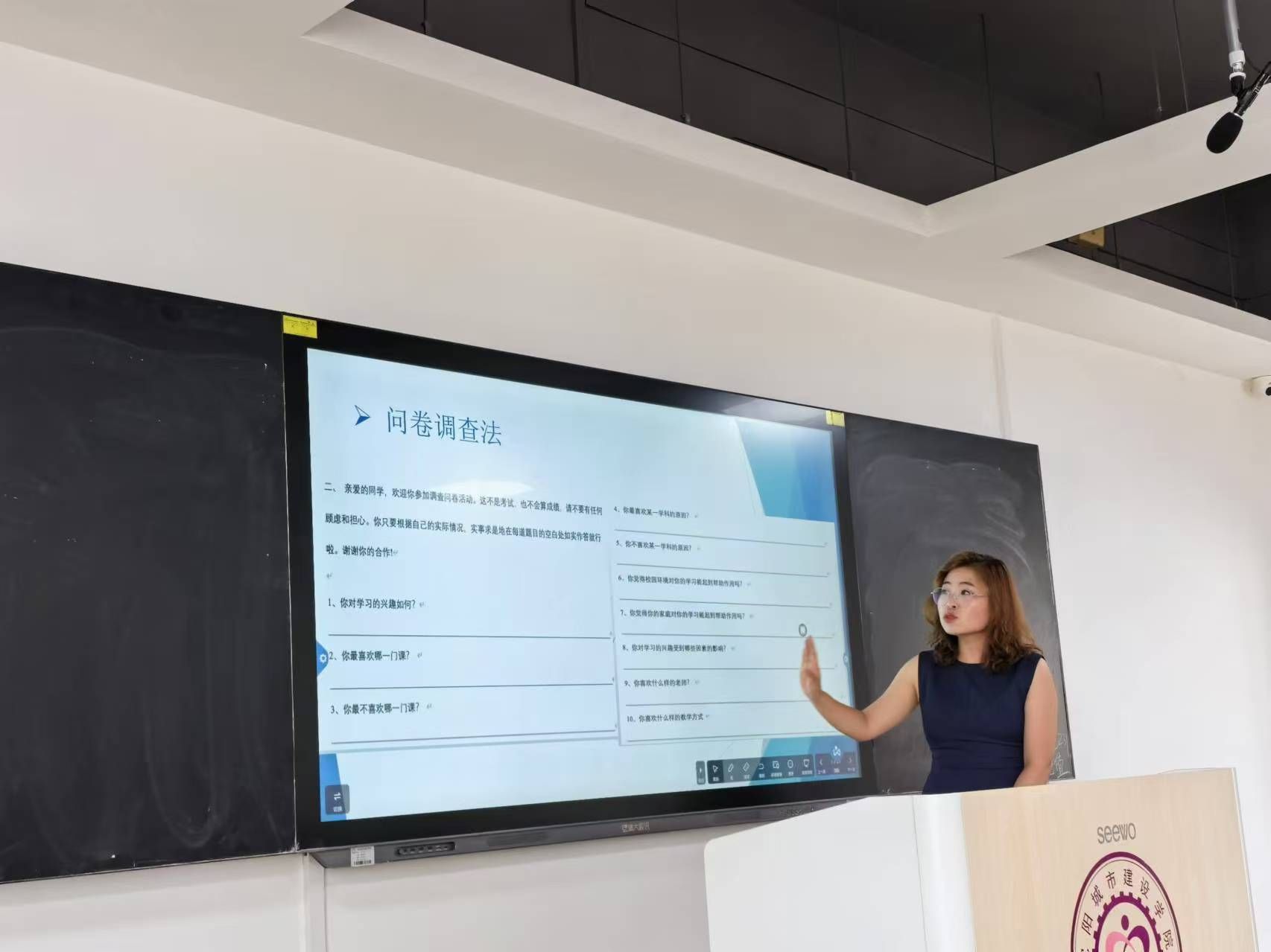 邢欢以“教学方法研究与创新”为题进行了学习收获分享,建议大家灵活选择与运用多样化的教学研究方法,讲解了问卷调查法、话语分析法、访谈法等教学方法,并重点针对问卷调查法如何设计进行了分享;同时演示了利用AI技术辅助完成教学设计工作,作为教学参考可进一步提高工作效率,增强课堂设计效果。