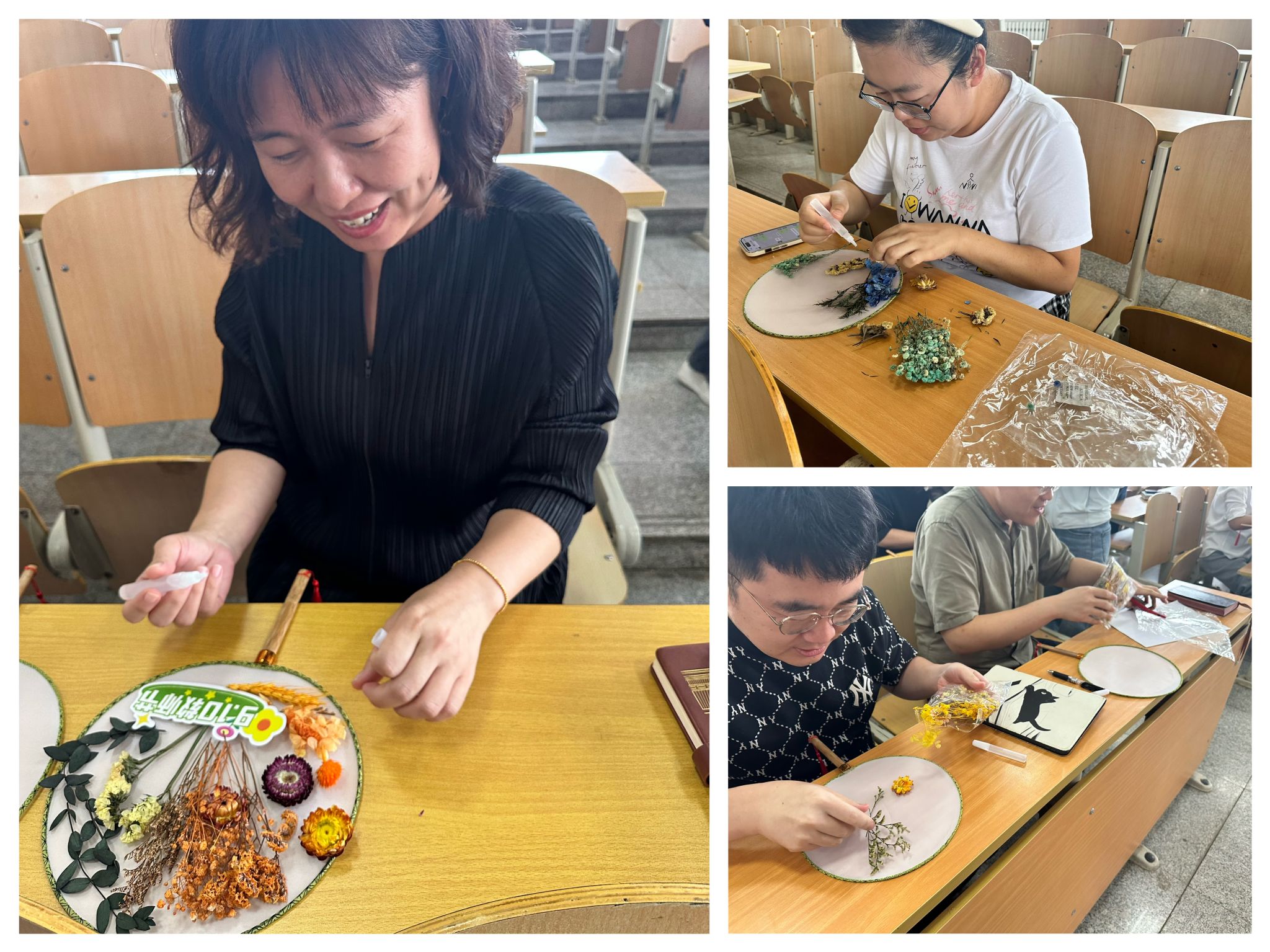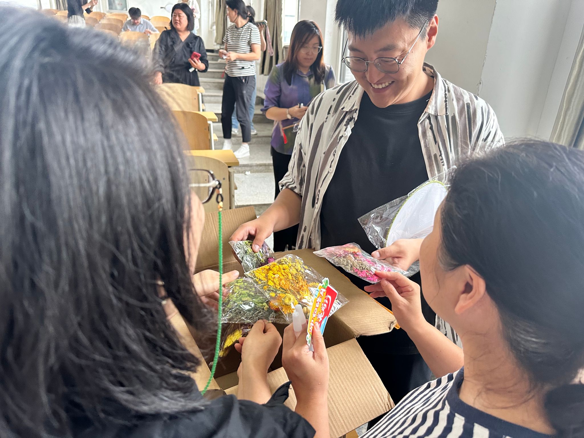 首先,于明鑫向全体教师表达了节日的祝福,同时鼓励大家发扬教育家精神,凝聚天小力量,坚定理想信念,以饱满的教育热情为党育人,为国育才,用自己的人格之美,专业之美,形象之美托举起国家的希望,民族的未来,绽放属于自己的教育芳华。接着,于明鑫为在座教师介绍了团扇的搭配、花材的挑选、处理的技巧和步骤等知识,并就DIY团扇的方法和技巧作了现场演绎,让在座的教师对手工团扇艺术有了更为直观的了解和认识。随后,教师们积极动手实践,选取花材,制作团扇。不一会儿,各具特色的团扇作品就接二连三地展现在大家的眼前,活动现场一片欢声笑语。